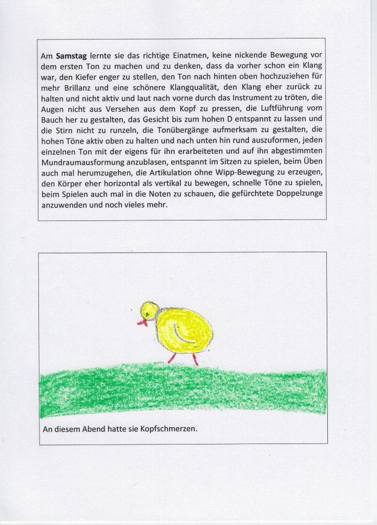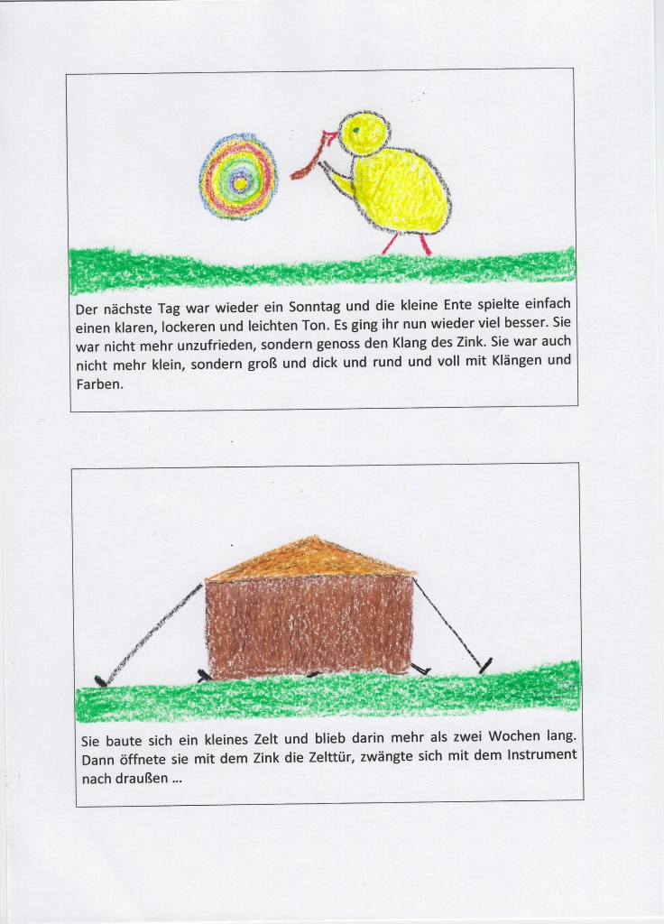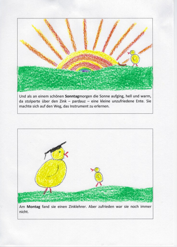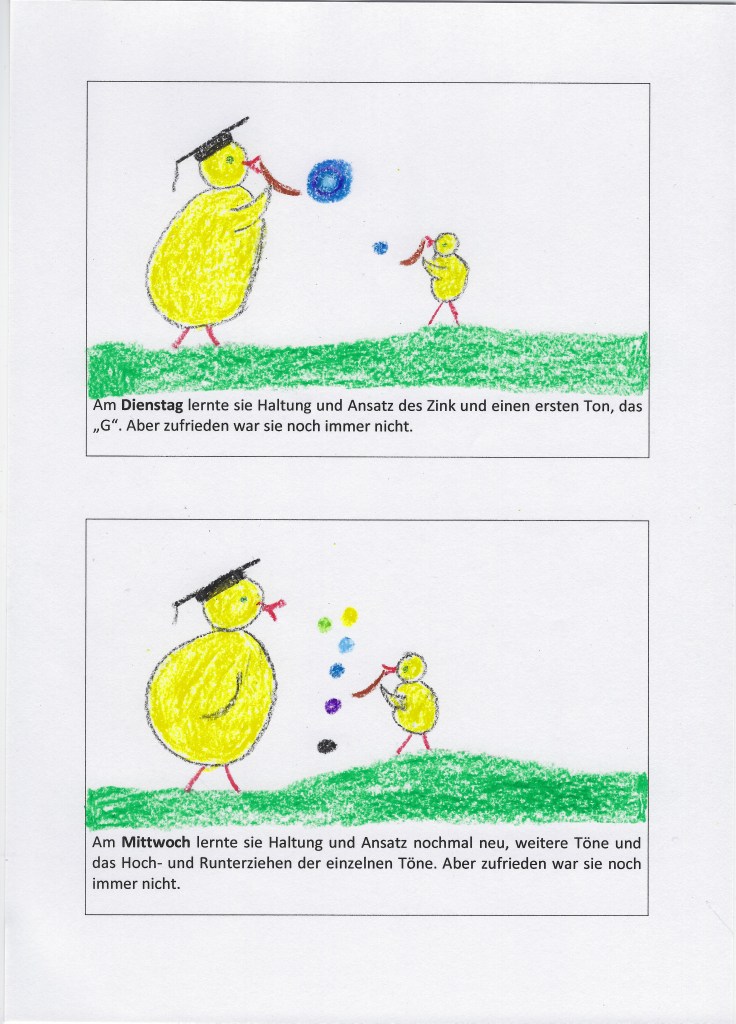 In Anlehnung an „Die kleine Raupe Nimmersatt“ von Eric Carle habe ich Ende April 2019 die Geschichte meines Zinkunterrichtes in Farben dargestellt und nicht nur mit Wörtern beschrieben. Es ist so verlockend, die wunderbare Welt der Klänge mit schönen Farben abzubilden.