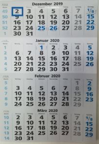 Im Sommer habe ich zusammen mit einer jungen Kollegin ein Büro neu bezogen. Wir haben eine schöne neue, hellgraue Büroausstattung bekommen, die Regale schnell füllen können mit unseren bunten Akten und haben Bilder an die Wände gehängt für ein bisschen Wohlfühlatmosphäre. Mitten im Kalenderjahr konnten wir aber leider keinen vernünftigen Wandkalender mehr bekommen und haben bis Ende November wirklich gelitten bei der täglichen Ansicht des unübersichtlichen kleinteiligen Kalenders, der noch vorrätig war und den wir übergangsweise aufhängen mussten. Endlich wurde es Dezember und wir haben sofort die Notlösung für 2019 abgenommen und den Kalender für 2020 im gewohnten übersichtlichen Design aufgehängt. Nun erfreuen wir uns jeden Tag an dem klaren Anblick. Es ist schon erstaunlich, mit wie einfachen Mitteln man uns als Verwaltungsbeamtinnen glücklich machen kann.