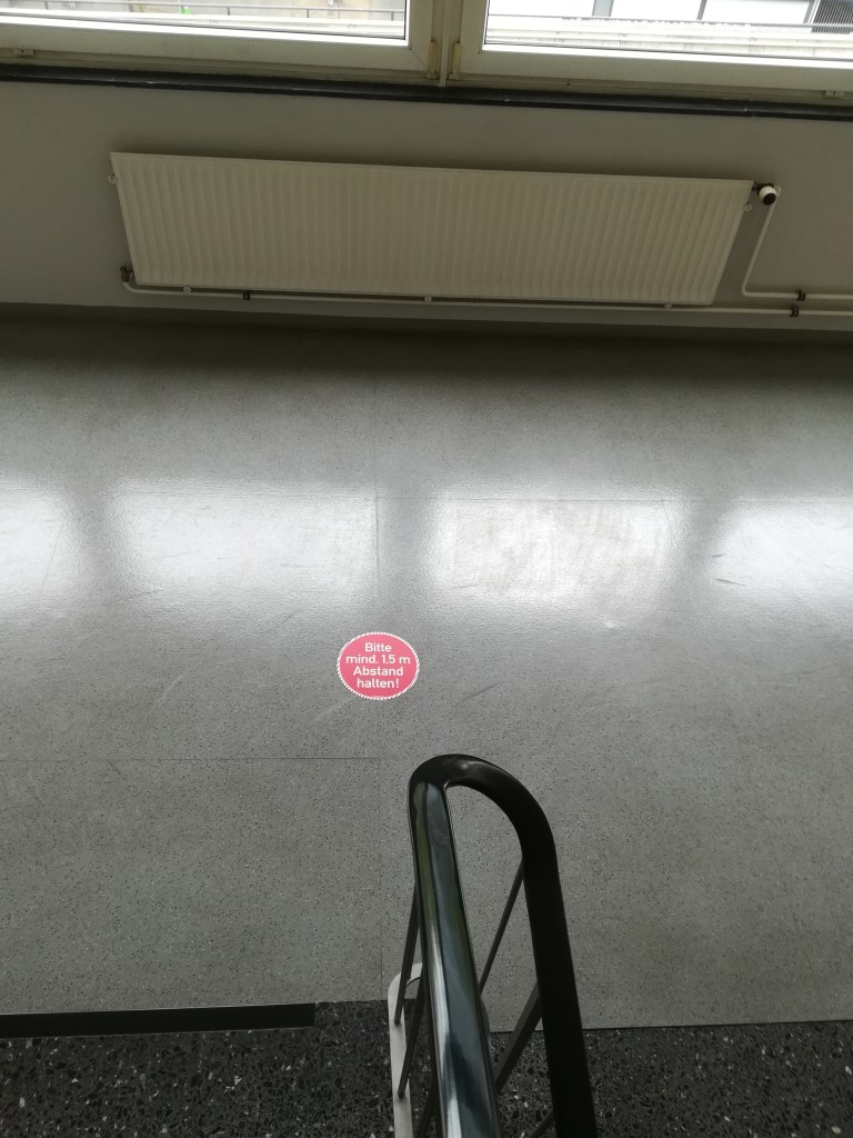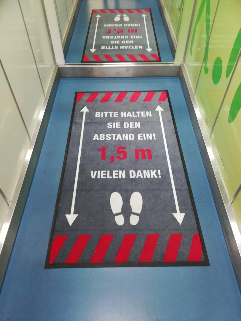 Auch mein Arbeitgeber sorgt sich um meine Gesundheit und gibt mir Hilfsmittel an die Hand, damit ich meinen Kolleginnen und Kollegen nicht aus Versehen zu Nahe komme. Es dürfen bei uns im Gebäude jeweils zwei Menschen zusammen einen Fahrstuhl benutzen. Die Bodenmarkierung in den Fahrstühlen hat mir aber Rätsel aufgegeben, die ich bislang noch nicht lösen konnte: